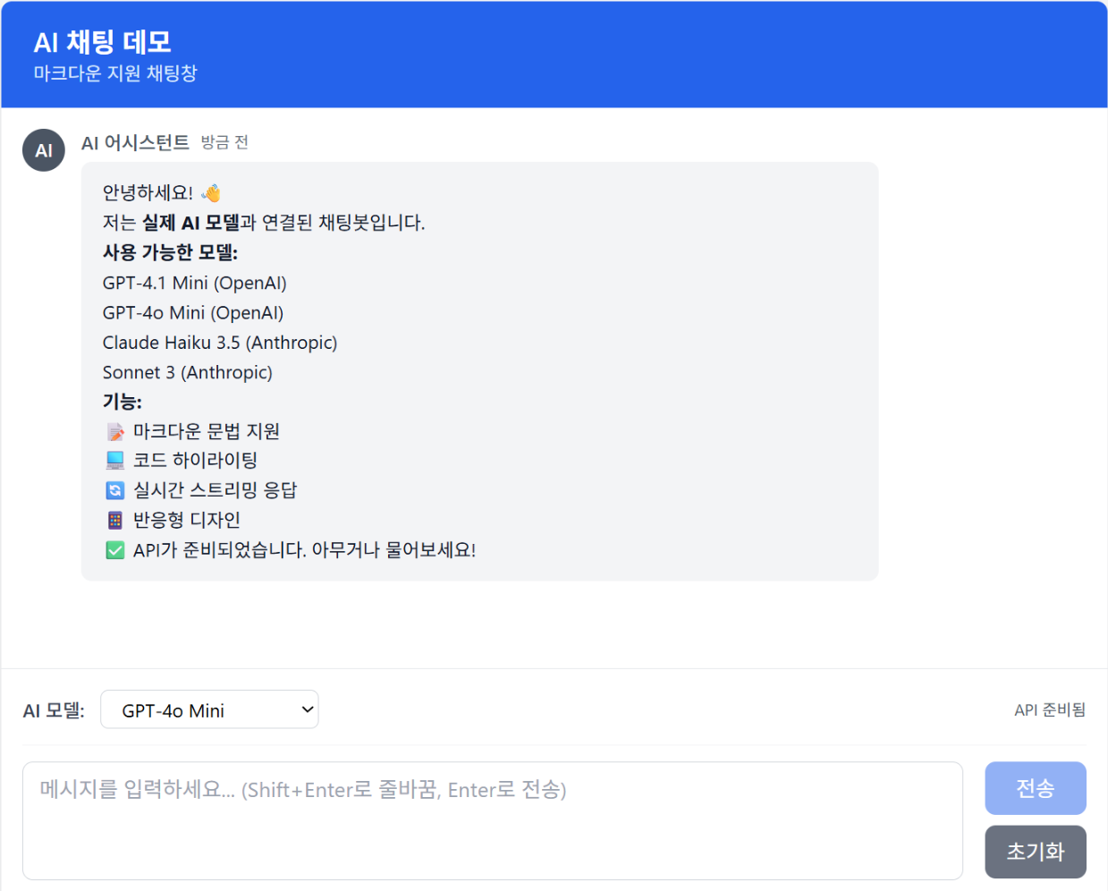 - 실시간 스트리밍: ChatGPT처럼 글자가 실시간으로 타이핑되는 자연스러운 UX